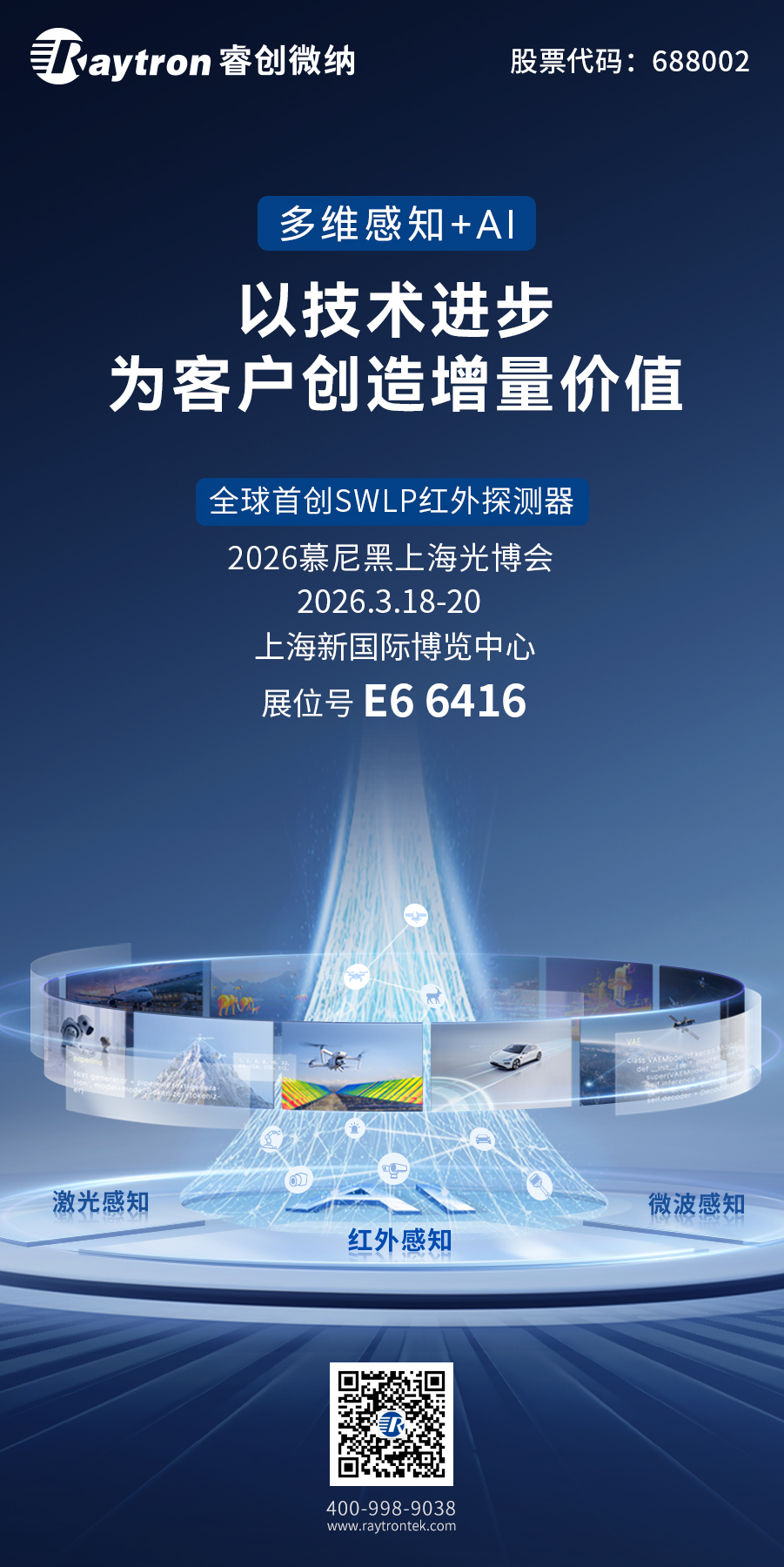 3月18日,2026慕尼黑上海光博会盛大开幕。此次展会,睿创微纳依托自研核“芯”技术,提供覆盖工业测温、安防消防、辅助驾驶、机器视觉、消费电子等场景全链路解决方案,全面呈现“多维感知+AI”技术创新,以技术进步为客户创造增量价值。